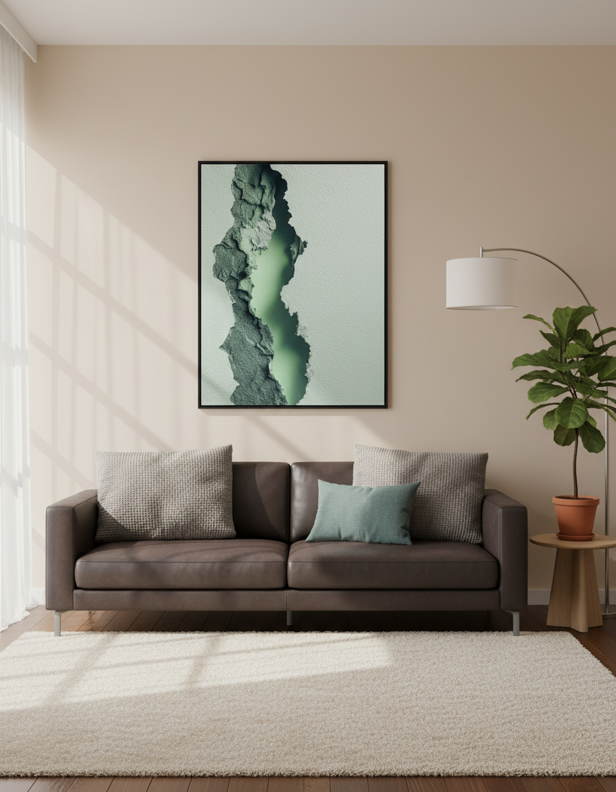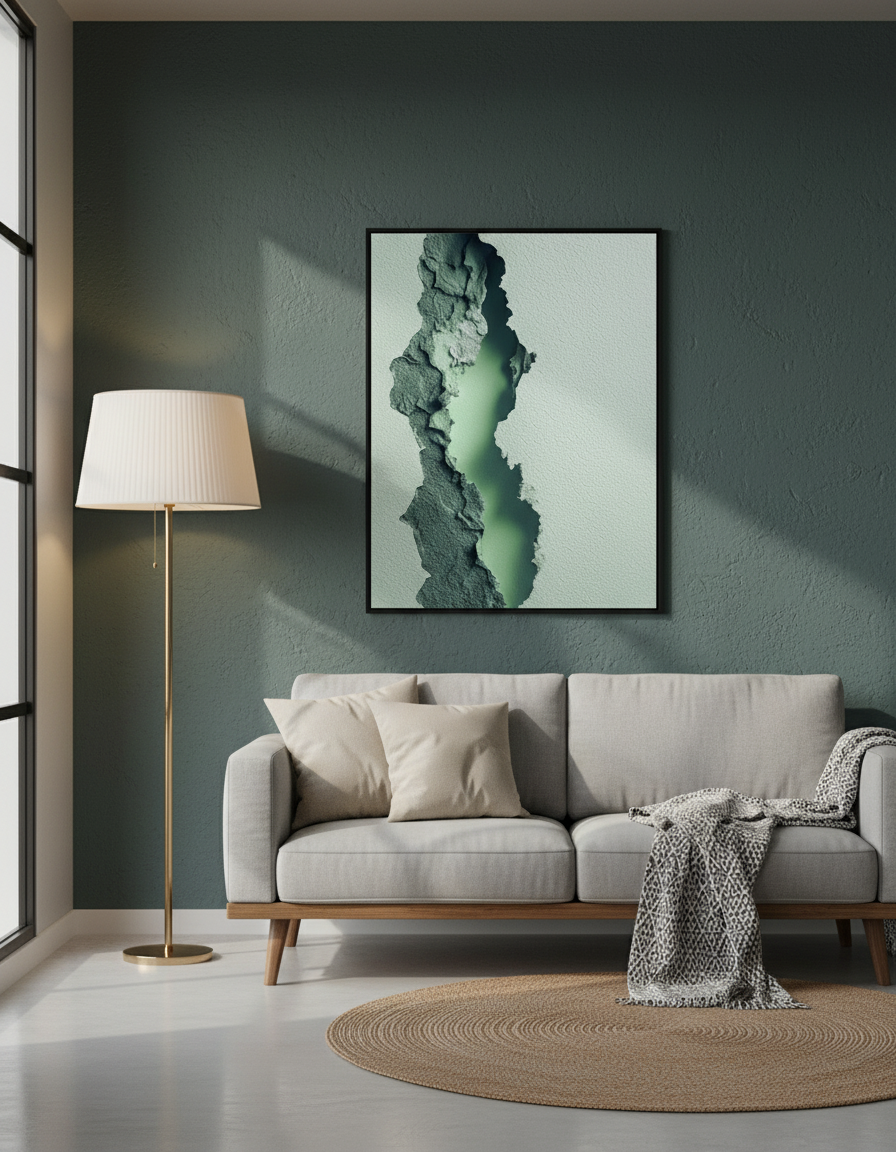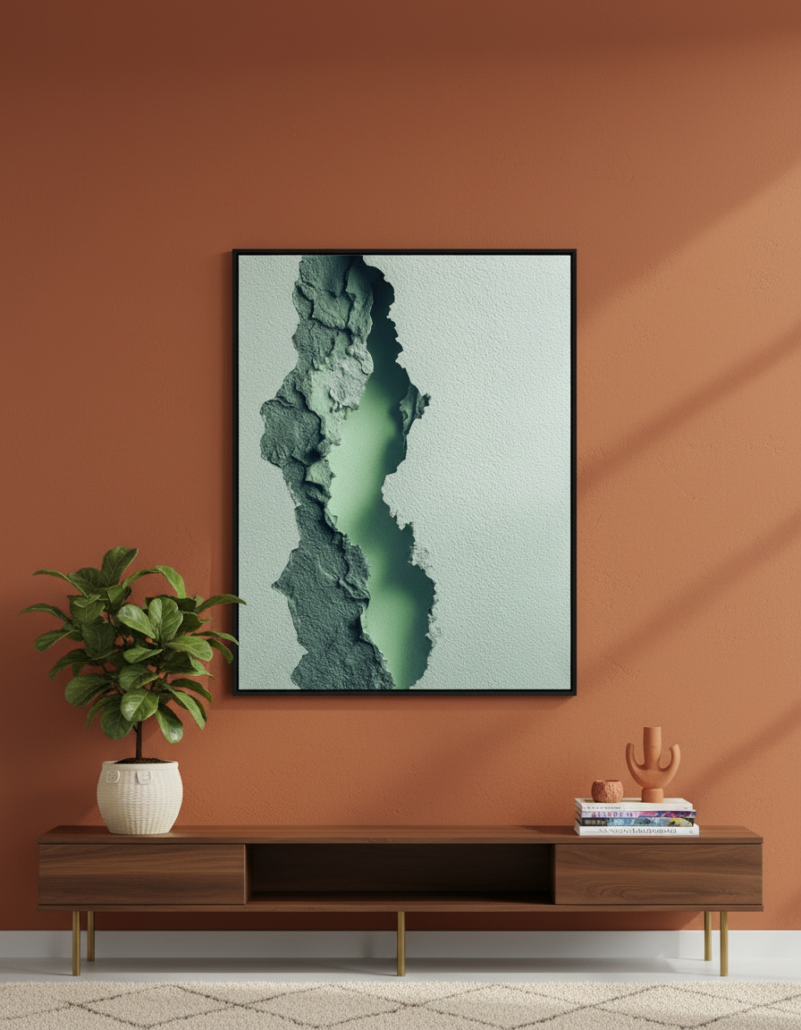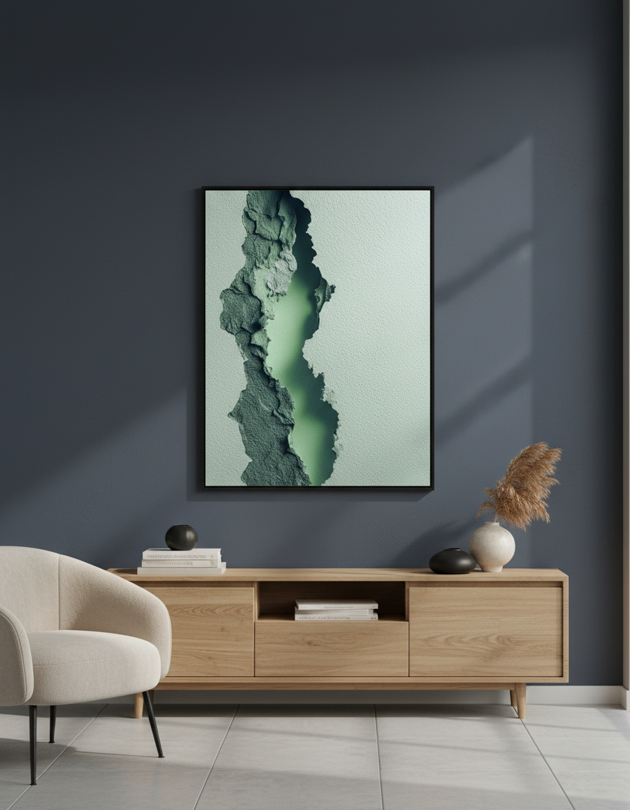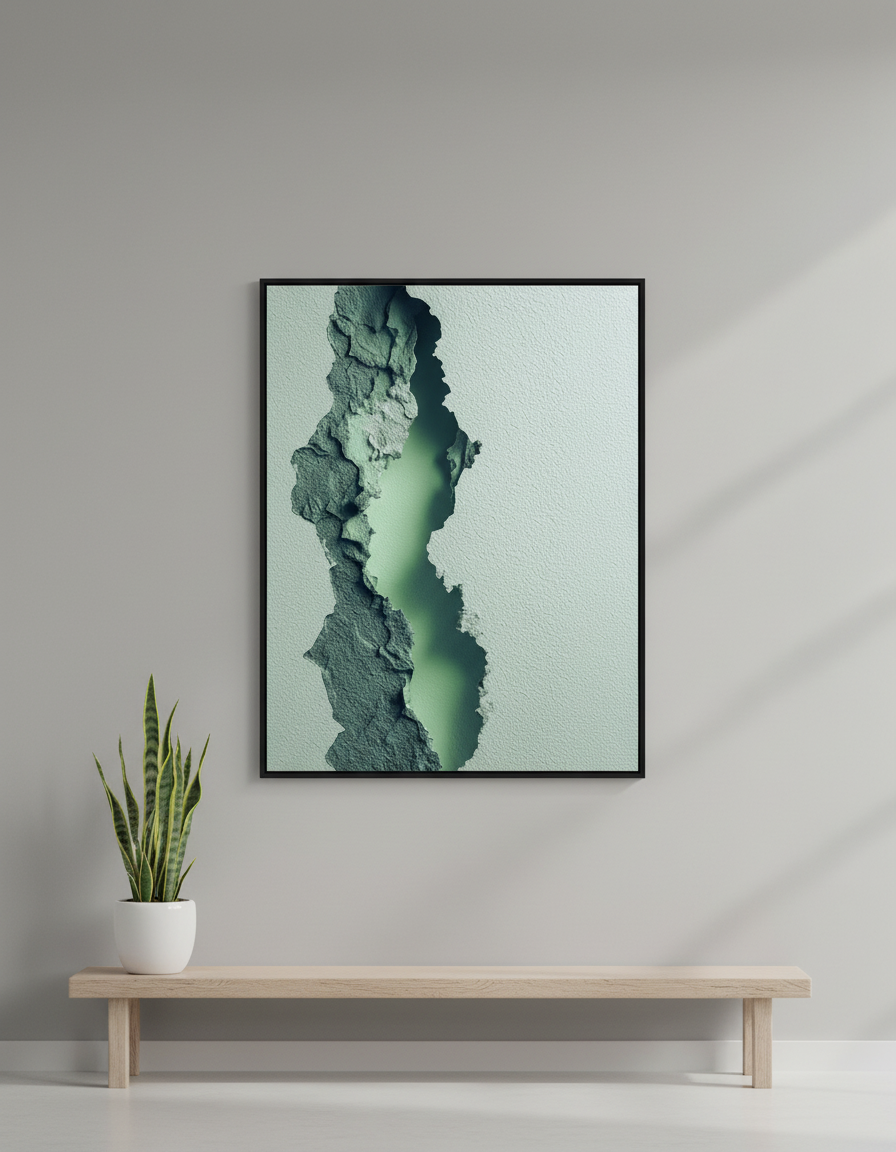 البرواز ده شبه نافذة صغيرة بتتفتح وسط الجدار وتكشف طبقة هادية من لون أخضر ضبابي، كأن الطبيعة نفسها بتهمس من تحت السطح. التصميم قائم على Texture حجري متشقق بملمس واقعي، ومركزه فتحة ضوئية ناعمة بتدي عمق وهدوء في نفس الوقت.