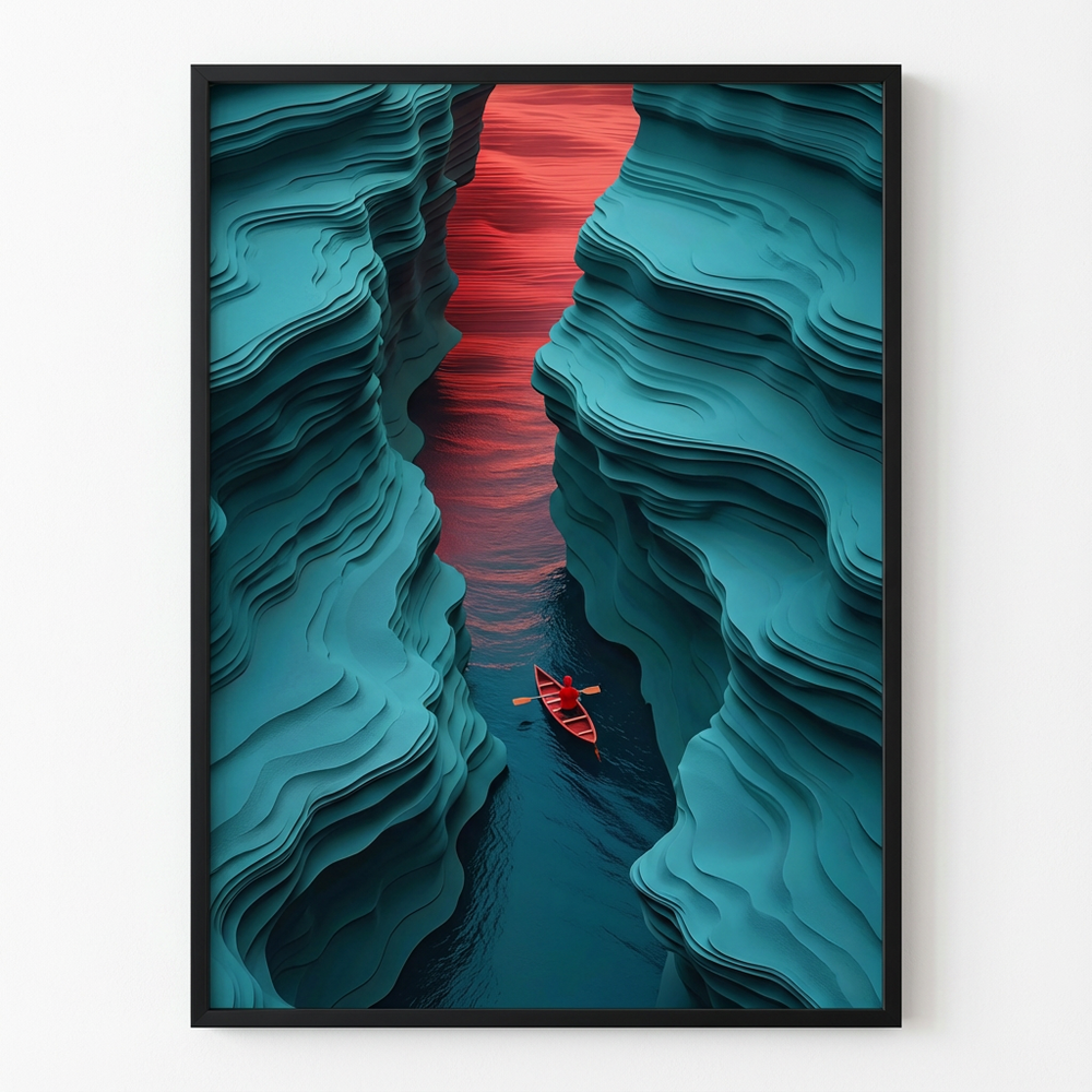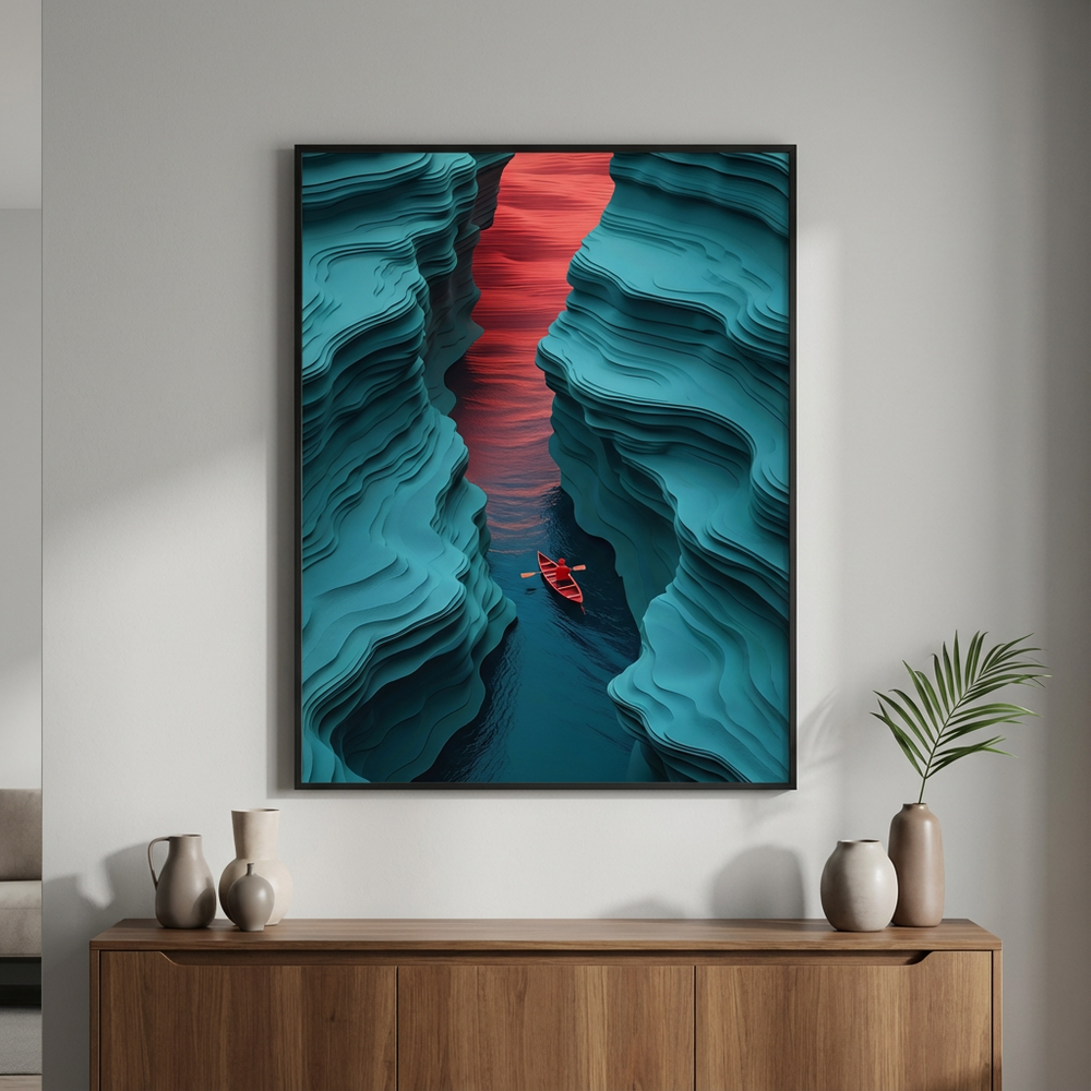 البرواز ده أشبه برحلة صغيرة محفورة وسط صخور طبقية ناعمة، تتلوّن بدرجات الأزرق العميق، وفي النص قارب أحمر وحيد عائم كأنه بيشق طريقه ناحية ضوء الغروب. لمسة فنية فيها هدوء، وجرأة، وعمق بصري يخطف العين من أول نظرة.