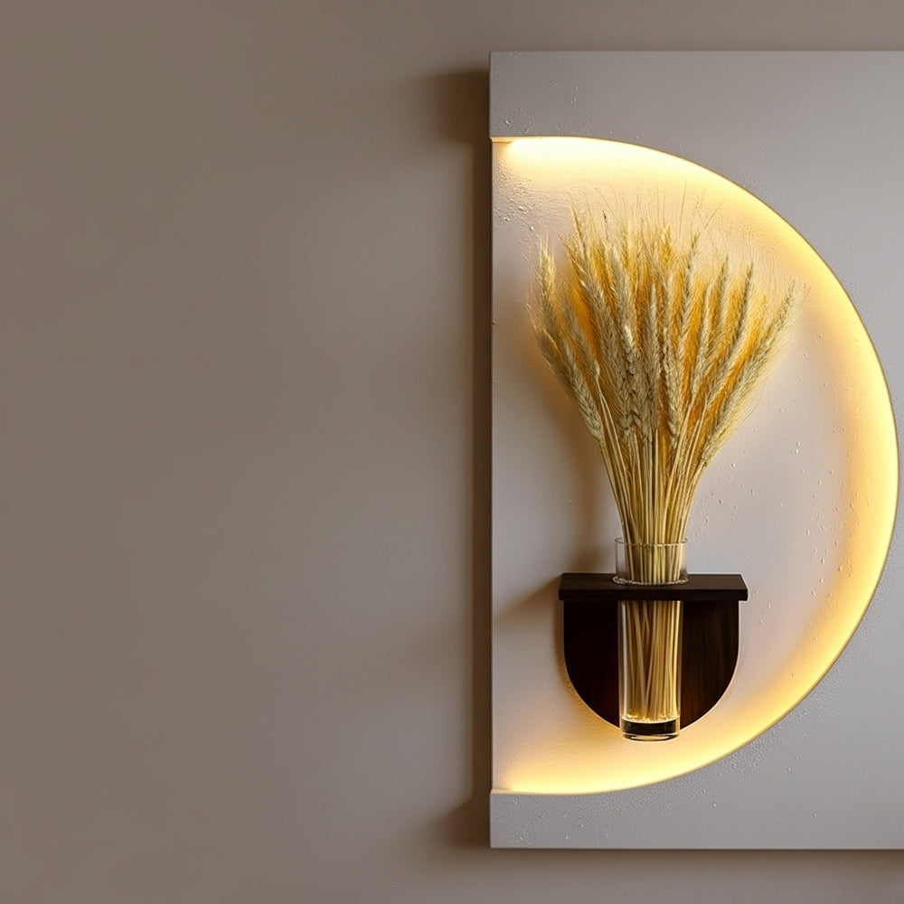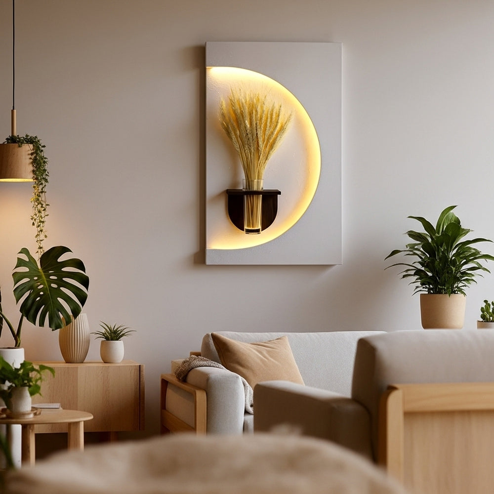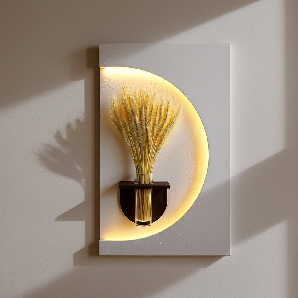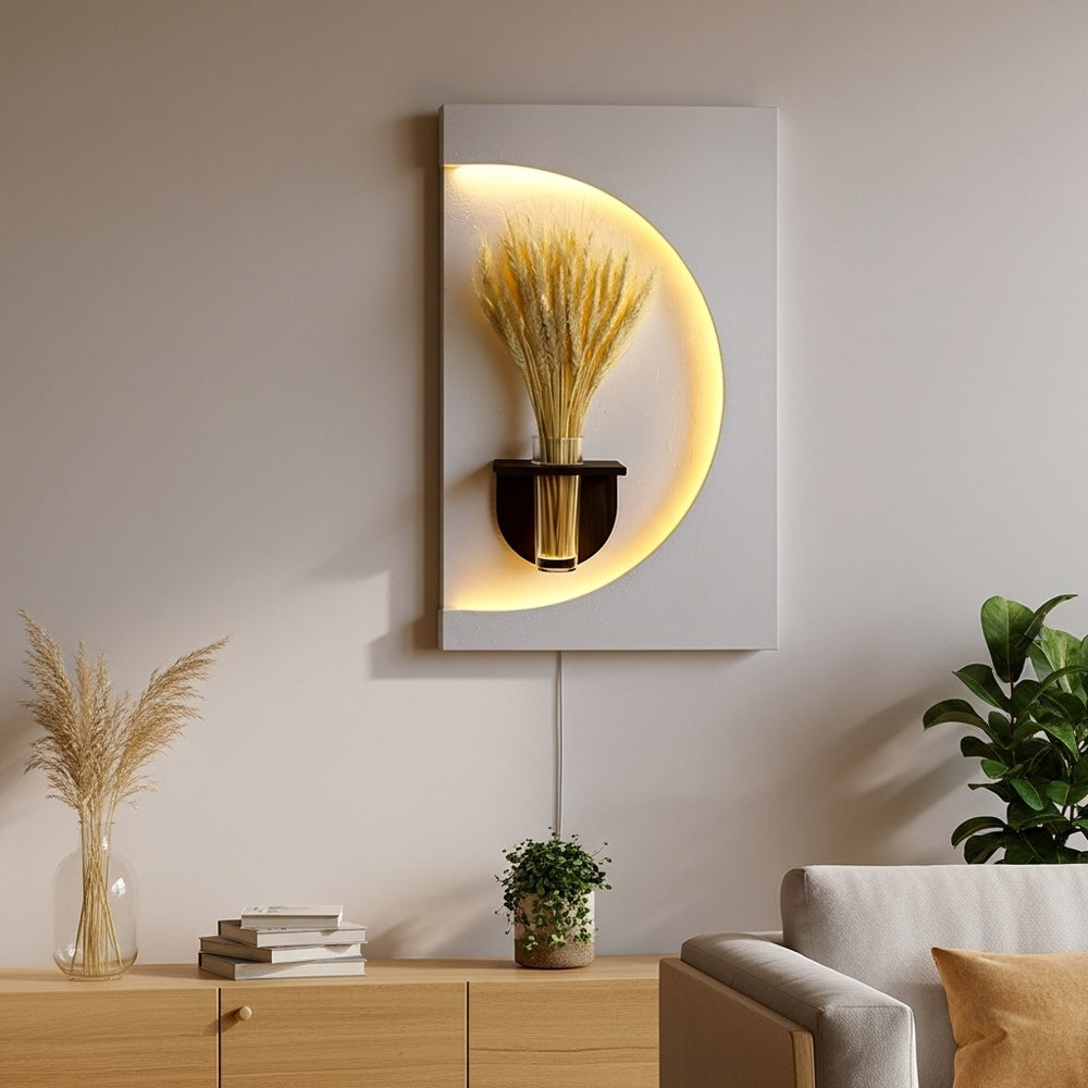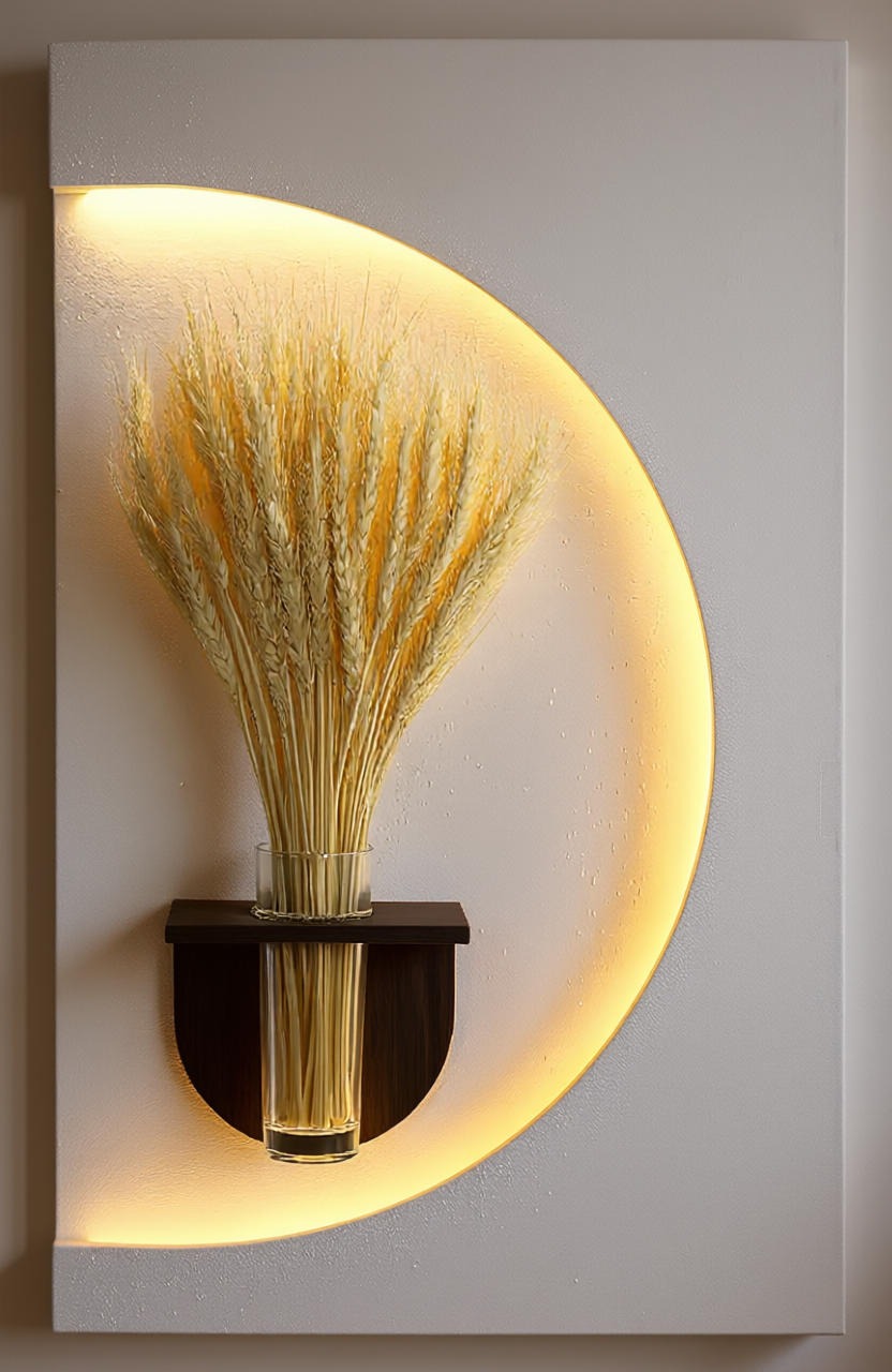 تتميّز هذه القطعة اليدوية بإطار خشبي منحني مستوحى من جمال شكل الهلال، مزين بسيقان قمح ناعمة وإضاءة LED دافئة تخلق أجواء هادئة ومريحة.