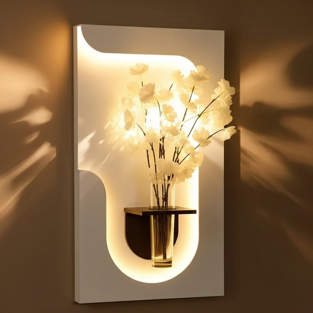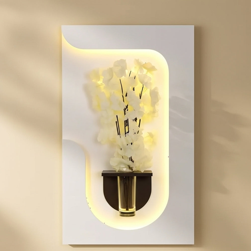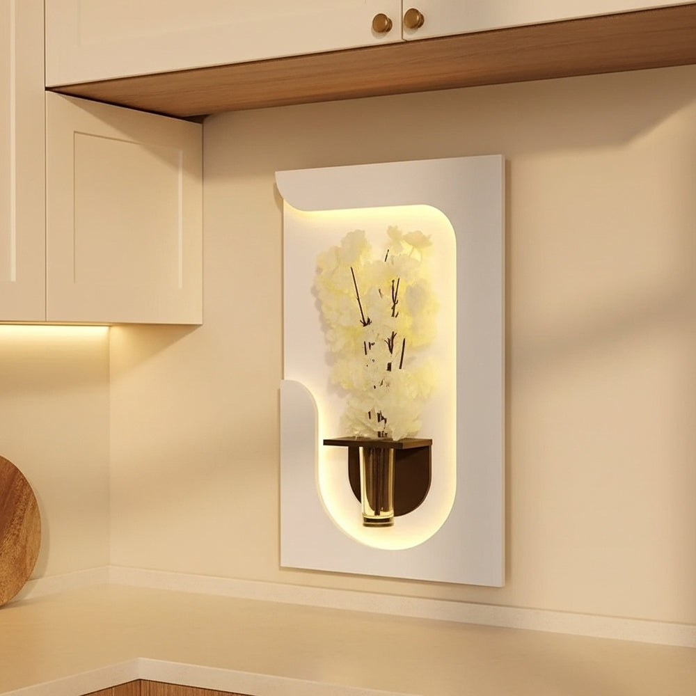 يأتي بإطار خشبي منحني على شكل موجة يرمز إلى الانسيابية والسكينة، بينما تضيف الزهور البيضاء الناعمة مع الإضاءة الدافئة لمسة من الصفاء والفخامة لأي مساحة.