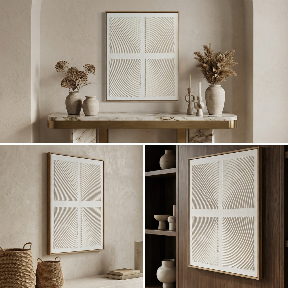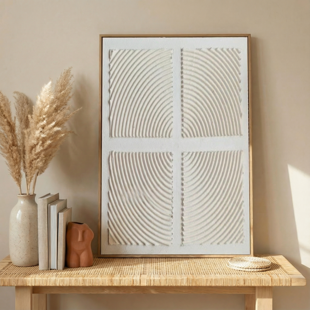 This artwork is created using sculpted paste techniques, divided into four textured quadrants where curved, repetitive lines interact with light and shadow. The result is a calm visual movement that adds depth and interest while maintaining a clean, minimalist presence.